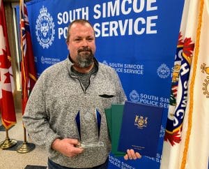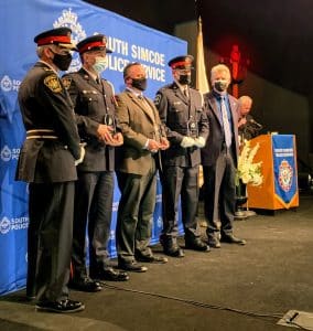 Pictured are Shelieen Goobie, Bruce McMaster and left to right in bottom photo Chief Andrew Fletcher, Detective Constable Andrew Smith, Constable Jon Ellis, Constable Spencer Green and Police Services Board Chair Chris Gariepy.