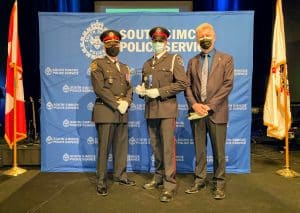 Of the many calls officers attend, this was a high risk situation.  These two officers used sound judgment along with their experience and knowledge to safely apprehend a suspect with a deadly weapon with no lasting injuries to anyone.  We commend their professionalism.  The officers were honoured at our annual Service Recognition Awards Ceremony on February 24, 2022.